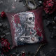 Männliche Schädel Cameo in Red Throw Kissen. © Dunkles Herz Wünsche. Ein gotisches Kissen in Rot mit einem Kamo eines weiblichen Skeletts mit silbernen Haaren, auf dem Schmuck und Rose stehen.