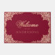 Ein elegantes bordeauxfarbenes und rosafarbenes Design mit aufwändigen Ästen und goldenen Rose-Blätter in den Ecken. Das Wort Willkommen ist auch in der Rose Goldkalligraphie, der Familienname darunter in Kappen. Der Text lautet "Welcome to the [Last Name]" Der Hintergrund ist bordeauxrot.