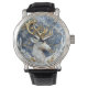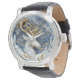 A beautifully crafted watch features a majestic deer with golden antlers set against a stunning blue marble background.