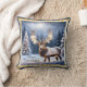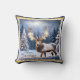 Kissen mit festlichem Gemälde eines Rentiers mit glitzerndem Licht in einer schneebedeckten Landschaft mit Kiefern. Mit einem goldstilisierten Rahmen-Design. Schön zu Weihnachten.