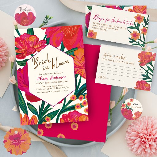 Diese helle und kühn-farbene Rosa- und Orangenblütenbraun im Blütenthema Brautdusche Die Einladung enthält Blume in Rosa, Rot und Orange mit botanischen Blätter. Eine perfekte Braut in blühender Frühlingsbrause Braut für Ihren großen Tag.