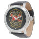 Dieses Design ist mit einem roten und schwarzen Feuerwehremblem auf schwarzem Hintergrund ausgestattet.