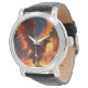 Fiery Galaxy Watch Face: Ein faszinierendes Uhrengesicht, das eine wirbelnde Nebel-Blase mit lebhaften Orangen, Rot und Gelb zeigt. Flecks aus weißem Glitzer stellen entfernte Sterne dar und erzeugen einen fesselnden Tanz von Feuer und Kosmos.