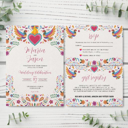 This Fiesta Colorful Flowers Botanical Spanish Wedding Save the Date vibrant design features two colorful birds in the top corners, framing a large red heart with a glowing flame above it, evoking a sense of love and passion. Surrounding the central area are intricate floral patterns and leaves, arranged symmetrically in bright hues like pink, orange, green, and blue, inspired by traditional Mexican folk art. The overall feel is festive and romantic, with a lively composition that draws the eye to the center, making it ideal for a wedding stationery.
