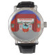 Die Sterne sind auf dieser Retro Movie Theatre Watch in aller Kraft - sowohl die Sterne am Nachthimmel als auch die Sterne auf dem silbernen Bildschirm. Dieses minimalistische Kunstdesign im Stil der 60er Jahre besticht durch die Fassade eines klassischen Kinos aus dem Goldenen Zeitalter des Kinos. Das rote Gebäude hat ein leuchtend beleuchtetes Marquee, in dem steht: "JETZT ZEIGEN", in roten Buchstaben. Unter dem Marquee ist ein Theaterangestellter bereit für eine Menge von Filmemachern, die mit Sicherheit in Scharen unterwegs sind. Die Silhouette des sauberen Schnitt, Theaterarbeiter ist einfach durch das Aqua-Glas der Kasse-Kasse-Stand zu sehen. Kein Popcorn-Kernel kann auf dem makellosen grauen Bürgersteig gefunden werden. Graue Doppeltüren flankieren den Kartenstand. Die Vorderseite des Gebäude zeigt schwarz-weiße Filmplakate, die von dramatisch beleuchteten Rahmen umgeben sind. Ein Poster zeigt Sternenliebhaber in einer dramatischen Szene, und das andere zeigt ein Schwimmanzug mit einem Sternchen, dessen Karriere so hell ist wie die Sonne, die sie anbetet. Dieses Produkt stammt von den brillanten Köpfen von Zazzles StrangeLittleZion, die Ihnen solche Kult-Klassiker wie Retro Pool Party, Film Noir Martini und Retro Space Age Cartoon Couple gebracht haben. Kritiker stimmen zu, wenn Sie nur ein Design in dieser Saison kaufen können, machen es dieses (oder eines der anderen spektakulären StrangeLittleOnion Designs)!