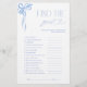 Das Hotel Find the Guest ist ein raffiniertes Eisbrecher, das die Gäste mit dem mühelosen Charme verzaubern und jedes Brautparty in eine lebendige und vernetzte Ansammlung verwandeln soll. Mit einer Reihe von eindrucksvollen Aufforderungen ermuntert dieses Spiel die Gäste dazu, sich zu vereinen, Geschichten zu teilen und lustige Fakten über einander zu entdecken - während sie gleichzeitig die zukünftige Braut feiern. Die zarte blaue Farbbandillustrierung und die klassische Typografie fügen eine Touch schlichter Eleganz hinzu und sorgen dafür, dass sich das Stück nahtlos in eine anspruchsvolle Veranstaltungslandschaft einfügt. Dieses Spiel ist perfekt für Brautpartys, Verlobungsfeiern oder auch Proben-Dinners geeignet, um unvergessliche Gespräche und sinnvolle Verbindungen zu schaffen. Ob Gäste sich zum ersten Mal treffen oder alte Freundschaften wiederbeleben, diese Aktivität fördert eine Atmosphäre der Wärme und Kameradschaft. Für passende Designs, Alternativfarben oder personalisierte Anpassungen ist der Designer gerne bereit, zusammenzuarbeiten, um die zusammenhängende Ästhetik Ihrer Veranstaltung zu verbessern. Copyright Anastasia Surridge, alle Rechte vorbehalten.