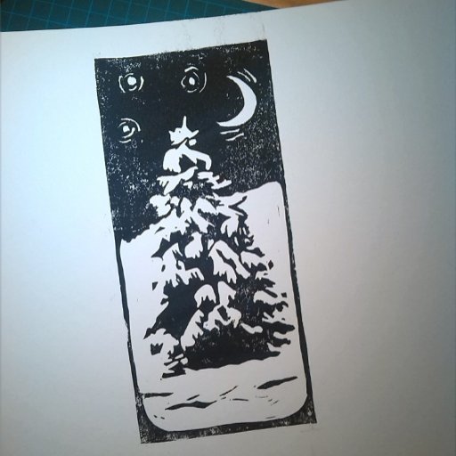 Schwarz-Weiß-Lino-Druck einer friedlichen Winterszene: Ein einsamer Tannenbaum, der nachts in einer schneebedeckten Landschaft stehend ist, mit einem Sternenhimmel.