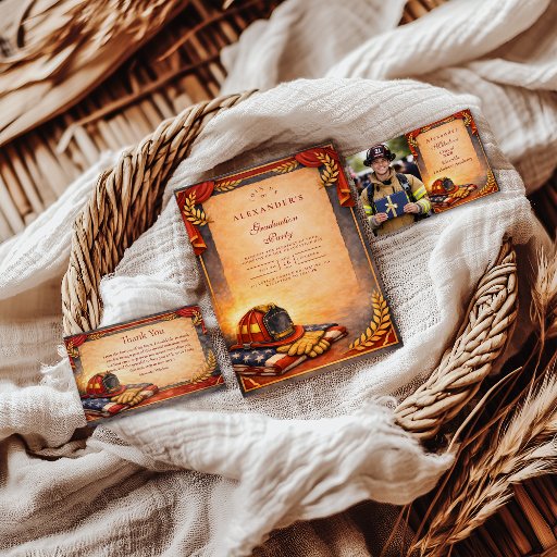 A bold firefighter graduation design featuring classic ceremonial elements, rich red and charcoal tones, and a traditional laurel frame symbolizing achievement and service. The illustrated helmet, turnout gear, and badge create a proud, respectful look perfect for honoring a firefighter’s milestone moment. Ideal for academy graduations, promotions, and first responder celebrations with a timeless, dignified style.