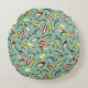 Dieses runde Kissen zeigt antike Illustrationen, die von Vintagen Fischköpfen in Rot- und Gelbtönen auf blassem aquamarinem Hintergrund inspiriert werden.