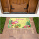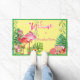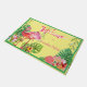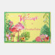 Anpassbar (Hintergrundfarbe und Namenstext) Flamingo Begrüßungsmatte. Hübsche Korallen, Gelb und Dschungelgrün dominieren in einem Paradies aus Blattwerk und Blume. Tropische Grüße heißen Ihre Gäste willkommen.