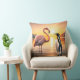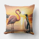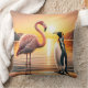Eine surreale Szene, die einen Flamingo und Pinguin nebeneinander aufnimmt und bei Sonnenuntergang lange Schatten auf einem schimmernden Ufer wirft.