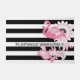 Die Produktgestaltung umfasst einen Flamingo mit kaleidoskopischen Paisley-Mustern in Rosa über schwarz-weißem Streifen Hintergrund. Dieses tropische Vogeldesign mit personalisiertem Text macht eine moderne und einzigartige Türmatte.