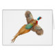 Ursprünglicher Kunstentwurf eines fliegenden Ringneck Fasans durch Designer Carolyn McFann zwei des schnurrenden Katzen-Studios auf einer kundengerechten Grußkarte für wilden Vogel lockert auf.