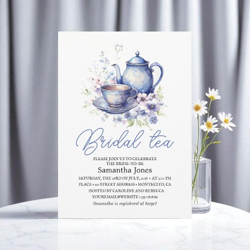 Floral Boho Blue Tea Pot Party Bridal Shower Einladung