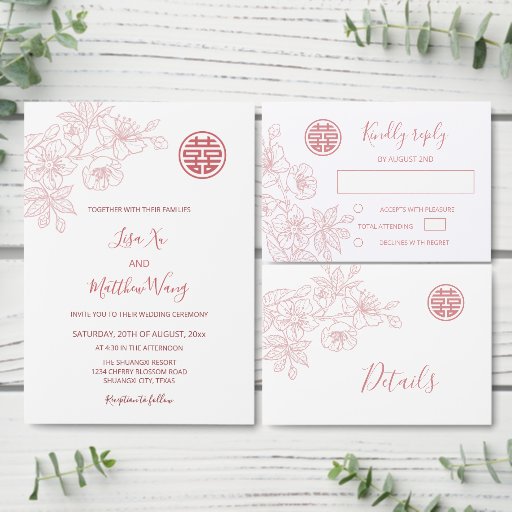 Diese chinesische Hochzeitskulisse besticht durch einen blühenden Zweig aus Kirschblütenkirsche und ein staubiges, doppeltes Glückssymbol auf weißem Hintergrund. Begrüßen Sie den Text in einem eleganten, handgeschriebenen Skript.