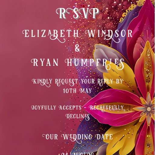 Dieses lebendige und kompakte Blumenbild ist die perfekte Wahl für eine Hochzeitssuite und verwandte Produkte. Die kühne Komposition zeigt eine atemberaubende Palette an geschichteten Blütenblättern in kräftigen Farbtönen von Fuchsia, Magenta, goldgelb und tief lila und schafft einen modernen, aber zeitlosen Anklang. Frische Akzente und glitzernde Texturen unterstreichen die Eleganz jedes Blütenblattes und verleihen ihm ein Gefühl von Feier und Romantik. Dieses Design eignet sich ideal, um einen anspruchsvollen Ton für Ihren besonderen Tag zu setzen, sodass es für Einladungen, RSVP-Karten, rett-the-date und eine Vielzahl anderer Hochzeitsartikel geeignet ist. Es ist ein vielseitiges Kunstwerk, das Luxus und Charme vermittelt, perfekt für ein Paar, das seinen Hochzeitstag mit Farbe und Kreativität bereichern möchte.
