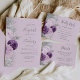 Die links Seite dieses eleganten, modernen Hochzeitseinladens besticht durch einen Blumenstrauß in lila und Lavendeltönen, bestickt mit Silberfolie aus Imitat und Imitat Glitzer und mit silberfarbenem Imitat-Glitzer. Der anpassbare Text kombiniert graue Handschrift, Copperplate und kursiv Schriftart auf einem blasslila oder lavender Hintergrund. Die Rückseite weist ein passendes Blumendesign auf.