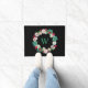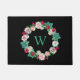 Einladende Türmatte in schwarz gemacht, mit Grafik eines bemalten Blumenkranzes. Ein grünes Monogramm mit einem Buchstaben, mitten im Kranz, ist bereit, sich selbst oder als großartige Geschenkidee für die Erwärmung eines Hauses zu personalisieren.
