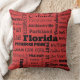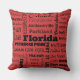 Dekorative Kissen sind eine stilvolle Weise, Persönlichkeit jedem möglichem Zuhause hinzuzufügen. Dieses zeigt eine Collage von Namen der populären Städte und der Großstädte in Florida im Schwarzen auf Lippenstiftrot, und die Rückseite ist festes Schwarzes.