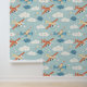Diese Tapete ist perfekt für ein Baby-Jungen-Kinderzimmer oder ein Baby-Jungs-Schlafzimmer. Sie zeigt wiederholt Bilder von Propellerflugzeugen, Wolken und Sternen. Die vorherrschenden Farben sind Rostorange, Gelb, Weiß und Blau auf einem hellblauen Hintergrund. Niedlich!