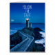 Leuchtturm in der Dämmerung blinkt sein Leuchtturm ins Meer. Die Worte "Folge dem Licht" sind in weißem Text geschrieben.