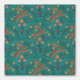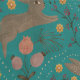 A whimsical pattern featuring leaping brown rabbits surrounded by yellow, pink, and red flowers, green leaves, and dotted accents on a teal background.