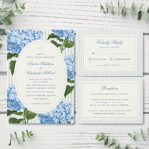 Eine formelle und elegante Hochzeitseinladung, die von den Trends "cottarget core", "Grand millennial" und "chinoiserie" inspiriert wird. Es zeichnet sich durch prächtige blaue Streifen als Hintergrund, Vintage Wasserfarbe Hydrangeas und elegante, zeitlose Typografie.