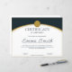 Designed for the modern workplace, this certificate features a stunning color palette of deep navy blue and metallic gold. The design includes a prominent gold wax seal emblem at the top, elegant curved gold lines, and a clean white center for maximum readability. The recipient's name is displayed in a beautiful, flowing black script font (shown as "Emma Smith"), adding a personal and prestigious touch.