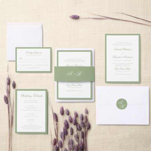 Invite your guests with timeless elegance using this formal sage green and white layered border script wedding invitation. Featuring a crisp white invitation framed with a refined sage green border and coordinating backing layer, this design offers a fresh, classic look with natural warmth. Elegant script typography paired with clean, traditional text creates a polished and formal layout ideal for garden, classic, and modern romantic weddings.