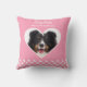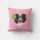 Individuell gestaltbare Fotoplatte in der Herzform in Rosa und Weiß. Die Vorderseite hat ein Foto und auf der Rückseite können Sie ein weiteres Foto hinzufügen. Über dem Bild befindet sich ein Text, der einen benutzerdefinierten Namen und Text liest: "Der beste Hund der Welt". Wenn Sie möchten, können Sie den Text durch Ihren eigenen ersetzen. Unten sehen Sie ein paar Pfoten mit weißem Hund.