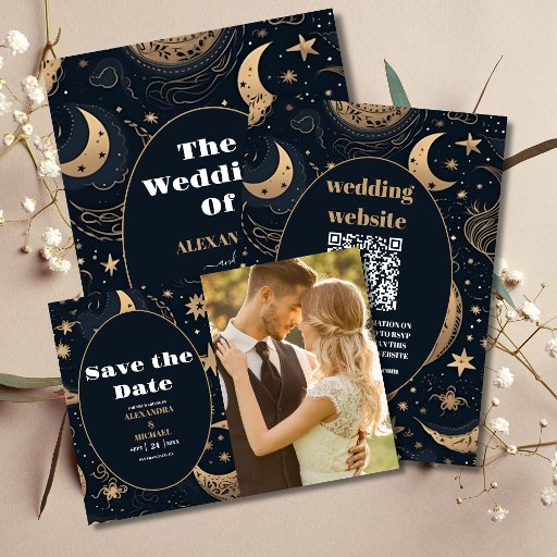 Foto Midnight Blue Gold Celestial Wedding Save The Date