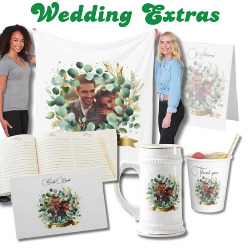 Hochzeit von Foto- und Textvorlagen, Neuvermählte, Jubiläumsveranstaltung mit Eukalyptus, grüne Blätter mit Goldakzenten Thema.