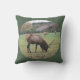 Dieses dekorative Kissen aus Outdoorstoff hat meine originelle Fotografie eines großen männlichen Elchs mit Geweih-Geweihe in einem grasbewachsenen Feld mit einer Scheune in der Ferne auf einem dunkelgrünen Hintergrund.