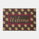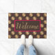 Dieses Fox Begrüßmatte Design zeichnet sich durch niedliche Füchse aus, die einen Bogen tragen, zweifarbige Kreise und rosa Sterne auf braunem Hintergrund.