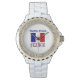 Personalisiert gesichtslose Frauenuhr zeigt die französische Flagge mit dem Wort FRANKREICH unten in Buchstaben, die mit der Tricolor farbig sind. Oben ist ein Platz für Ihren Namen oder den von jemand anderem, sodass Sie ein Geschenk oder ein personalisiertes Aussehen erstellen können. Cool für den Tag der Bastille. Großartiges Geschenk für sie. Spaß beim Anziehen von Wiedersehen.