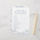 Machen Sie Erinnerungen mit der zukünftigen Braut in ihrem Brautparty mit dem bezaubernden französischen Blauen Flora, die das beste Spiel der Braut kennt. Dieses elegante Spiel ist die perfekte Unterhaltung für Brautpartys. Dieses Brautparty-Spiel dreht sich um das Feiern der Braut und um den Spaß mit den besonderen Frauen in ihrem Leben. Sehen Sie, wer die richtigen Antworten über das Leben, die Interessen und die Beziehung der Braut zu ihrem zukünftigen Ehemann bekommen kann. Der Gewinner bekommt einen Preis! Das Design der französischen Blauen Flora ist in einer sanft blauen und weißen Farbpalette gehalten, die sich durch die feinen Blumendetails auszeichnet und ein romantisches Vintages Ambiente schafft. Jede Braut schätzt die Eleganz und den Charme. Machen Sie das Brautparty mit diesem Must-have-Brautparty-Spiel besonders.