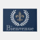 Noble französische silberne Lilie und weiße Lorbeer über einem Marineblauhintergrund mit dem Wort "Bienvenue" im weißen Text.