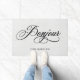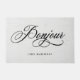 Diese französische rustikale und elegante Fußmatte sagt "bonjour" in der Wirblen, schwarzen Kalligraphie auf einem grauen, Leinenblickhintergrund und hat eine Stelle für Ihren Familiennamen.