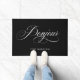 Diese französische moderne und elegante Fußmatte sagt "bonjour" in der Wirblen, weißen Skriptkalligraphie auf einem schwarzen Hintergrund und hat eine Stelle für Ihren Familiennamen.