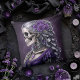 Männlicher Schädel Cameo im Lila Kissen. © Dunkles Herz Wünsche. Ein gotisches Kissen lila mit einem Kamo eines weiblichen Skeletts mit silbernen Haaren mit Schmuck und Rose darauf.