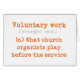 Die Karte liest: "Freiwillige Arbeit", verfolgt von der Lautübersetzung, zusammen mit einer Pseudodefinition, die ein Wortspiel auf den Voluntaristen ist, die von den Organisten in den Gottesdiensten "gespielt werden, welche Kirchenorganisten spielen vor dem Service." Innerhalb der Karte liest (und dieses kann geändert werden, wenn Sie Ihre Karte besonders anfertigen), "sie sollte obligatorisch genannt werden". Ideale Karte für Organisten oder Kirchenmusiker.
