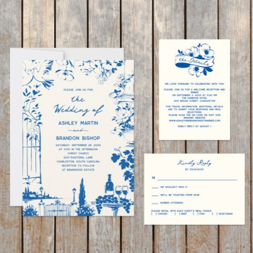 French blue European pastoral wedding program featuring a whimsical countryside style with classic old-world charm. Designed to include your ceremony details and wedding party, this elegant program blends romantic European inspiration with a clean, timeless layout. Ideal for garden weddings, destination celebrations, and traditional ceremonies. Personalize with names, date, program information, and wedding party details to create a coordinated and polished ceremony piece.