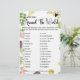 Fresh off the Market Wedding Traditions Game | Fun Brautparty Trivia Testen Sie Ihr Wissen über die ehelichen Bräuche mit unserem "Fresh Off the Market" Wedding Traditions Game! Dieses ansprechende und informative Spiel ist eine perfekte Ergänzung zu Ihrem Bauer Markt, Garten oder rustikalem Brautparty. Mit unseren handgezeichnet Produkten und wunderschönen Aquarellblumen ergänzt es Ihre natürliche Ästhetik. Hier ist das Spielen: Gäste erhalten eine Spielkarte mit Fragen zur Geschichte, Bedeutung oder Herkunft verschiedener Hochzeitstraditionen aus der ganzen Welt oder der Geschichte. Sie schreiben ihre Antworten auf, und dann zeigt der Gastgeber die richtigen Fakten auf. Es ist ein faszinierender Weg, lustige Trivien über Hochzeitsgewohnheiten zu lernen, Gespräche zu führen und freundlichen Wettbewerb unter den Gästen zu erleben! Die Spielkarte "Wedding Traditions" bietet klare Fragen und Raum für die Gäste, ihre Antworten in einem attraktiven, thematischen Design zu schreiben. Es ist eine einfache Aktivität, an Tischen zu verteilen, die interessante Fakten und Unterhaltung bietet. Koordinieren Sie dieses pädagogische Spiel nahtlos mit anderen Elementen aus unserer Kollektion "Fresh Off The Market", wie Einladungen, andere Spielkarten und Beschilderung, für ein wunderbar zusammenhängendes und unterhaltsames Eventthema. Passen Sie die Spielkarte einfach an, indem Sie den Namen der Braut, das Ereignisdatum oder die Fragen ggf. anpassen (abhängig von Zazzles Vorlagenfeatures). Verfügbar auf Premium-Cardstock oder als bequemer Print-at-Zuhause-Digitaldownload. Klicken Sie auf "Jetzt anpassen", um Ihre Fresh Off the Market Wedding Traditions Game Cards zu personalisieren und eine Touch interessanter Trivien und Spaß für Ihr Brautparty hinzuzufügen! Hochzeitsspiel, Brautparty Trivia, Frischspiel, Brautspiel auf dem Bauer, rustikales Hochzeitsspiel, Gartenpartyspiel, druckbares Brauchtum, Hochzeitsspiel, Funts, Blumendusche-Spielkarte