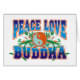 Frieden, Liebe Buddha! Sehr bunter Buddhismusentwurf in den grünen, blauen, weißen und orange Farben. Blumen und Blätter in der Mitte mit dem weithin bekannten Yin Yang Symbol. Friedens- und Liebetext oben und Buddha-Text unten! Wunderbare buddhistische Shirts und Geschenke!
