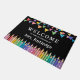 Farbenfrohe Begrüßungstür für ein Klassenzimmer, das mit dem Namen des Lehrers personalisiert ist, unter farbenfrohen Bannern mit bunter Flagge mit einer Reihe von farbigen Stiften in sanften Regenbogenfarben. Personalisierter Kindergarten mit farbenfrohen Stiften mit niedlichen Motiven. Niedliche Begrüßung an der Schultür personalisiert mit dem Namen des Lehrers in einem Bleistift grauen Schriftart mit hübschen Farben, die das Klassenzimmer aufhellen. Begrüßungsmatte für das Klassenzimmer mit farbenfrohem Design, perfekt für Grundschulen, Kindergarten, Vorschulen und vieles mehr. Art Tutor heißt Sie mit einem farbenfrohen, kinderfreundlichen Design willkommen.