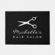 Friseursalon-Türmatte mit Friseurschere Silhouette Kontur Logo. Eleganter Schwarz-Weiß-Eintrittsteppich für Haarstylisten, Friseur, Friseur, Friseur, Friseur, Friseur, Schönheitssalon, Wellness-Center, Kosmetikerin etc. Fügen Sie Ihren eigenen beruflichen Firmennamen oder ein Angebot hinzu. Moderne Schrift-Typografie-Vorlage.