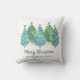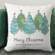 Fügen Sie dieses charmante festliche Kissen zu Ihrem saisonalen Dekor hinzu. Es ist mit weißen Weihnachtsbäumen in Grün- und Türkistönen dekoriert. Passen Sie es mit Ihrem Namen an. Original Wasserfarbe © Michele Davies.