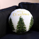 Frohe Weihnachten! Es ist ein doppelseitiges rundes Kissen und auf der Rückseite sind festliche Weihnachtsbäume.