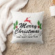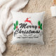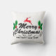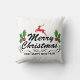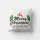Ein weißes Kissen mit festlichem Design. Das Design enthält die Worte "Frohe Weihnachten" in einem dekorativen schwarzen Skript-Schriftart, mit Schnörkeln, die sich von den Enden der Wörter. Oben "Frohe Weihnachten" ist eine rote Silhouette eines Rentiers springen, und auf beiden Seiten sind Heilige mit grünen Blätter und roten Beeren. Unter dem Haupttext "UND GLÜCKLICH NEUES JAHR!" wird in einem einfachen, fett gedruckten schwarzen Schriftart gedruckt. Der Stil ist sauber und grafisch und passt sich perfekt in die Gestaltung der Ferien an.