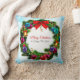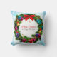 Das Weihnachtskissen mit einem Weihnachtskranz mit Ziergegenständen, Glocken und Bonbons und "Frohe Weihnachten & Glückliches Neues Jahr".